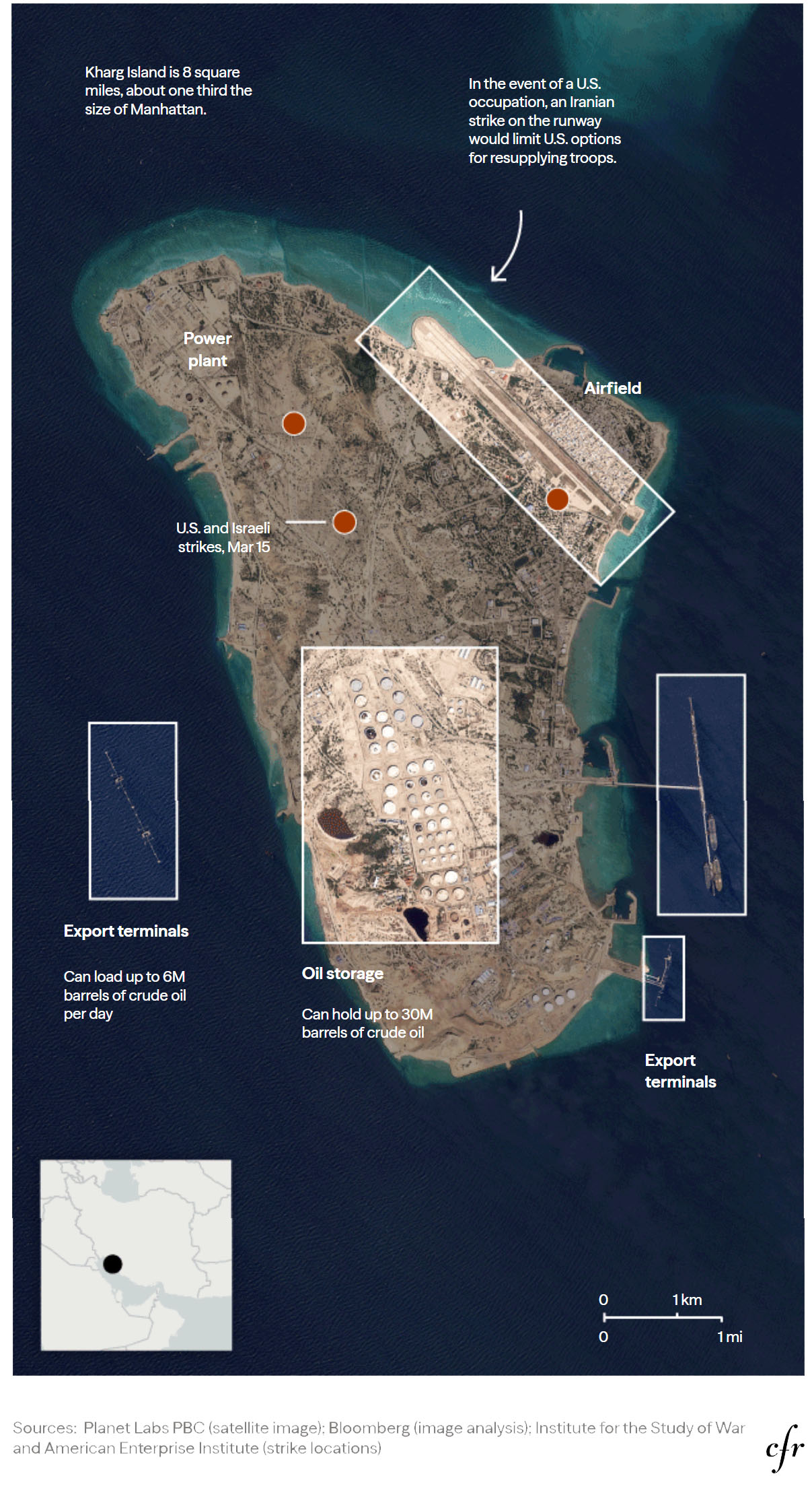 При цьому у War on the Rocks виходять з того, що "Іран, можливо, не захоче піддавати острів масованим бомбардуванням після висадки американських військ, оскільки це може призвести до руйнування його критично важливої інфраструктури, а її відновлення коштуватиме дорого і займе багато років".