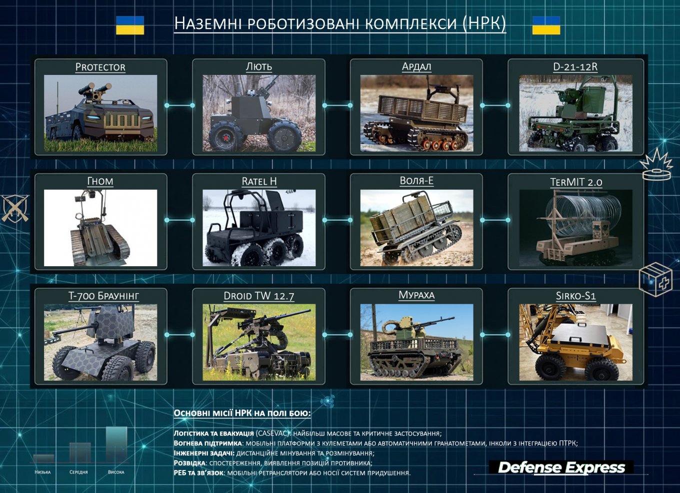 У цих умовах НРК стають одним із ключових рішень. Важкі платформи здатні перевозити сотні кілограмів вантажу та працювати в умовах бездоріжжя. Низькопрофільні (до 50 см заввишки) НРК знижують помітність і підвищують шанси виконання місії. За окремими оцінками, їх застосування дозволяє суттєво зменшити втрати серед евакуаційних груп.