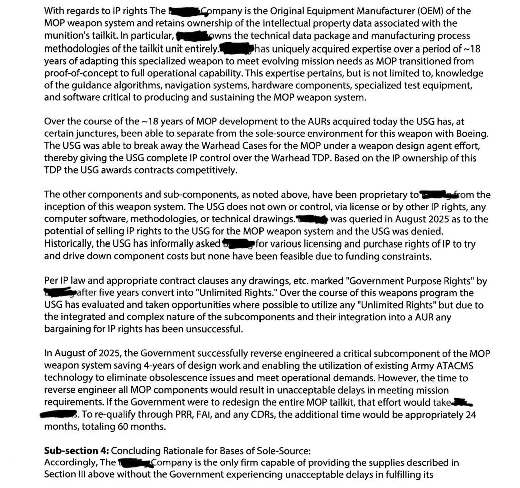 Цій неназваній компанії було запропоновано продати технічну документацію уряду США. Це могло б дозволити знайти іншого субпідрядника, який би справився з цією задачею швидше, або знайти інше рішення. Що зрештою й було зроблено за рахунок використання компонентів з балістичної ракети ATACMS. Але неназвана компанія, яка була виробником оригінального обладнання та зберігає інтелектуальне право власності, відмовила у передачі уряду цих прав.