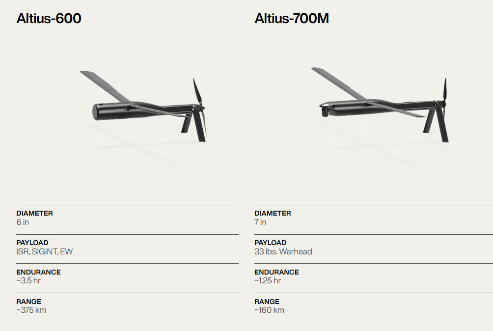 - дрон-камікадзе, що може уражати цілі на дальності 160 км маючи 15-кг бойову частину. А Altius 600 - розвідник, що має дальність польоту близько