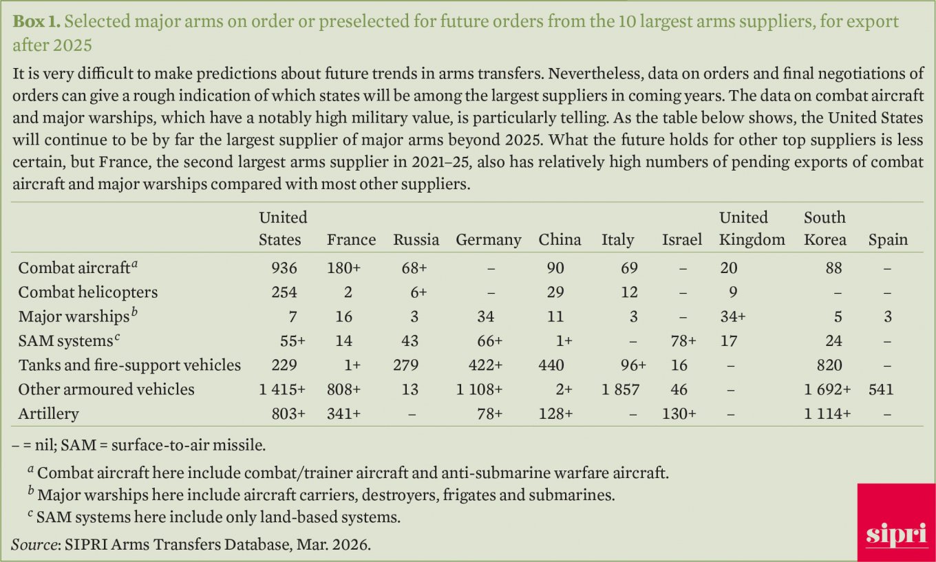 Зокрема частка ринку, яку у 2016-2020 роках займало російське озброєння складала 21%. А от у 2021-2025 роках вона скоротилась до 6,8%. А головними покупцями російського озброєння є Індія, 48% від всього російського збройового експорту, Китай та Білорусь по 13% у кожного.