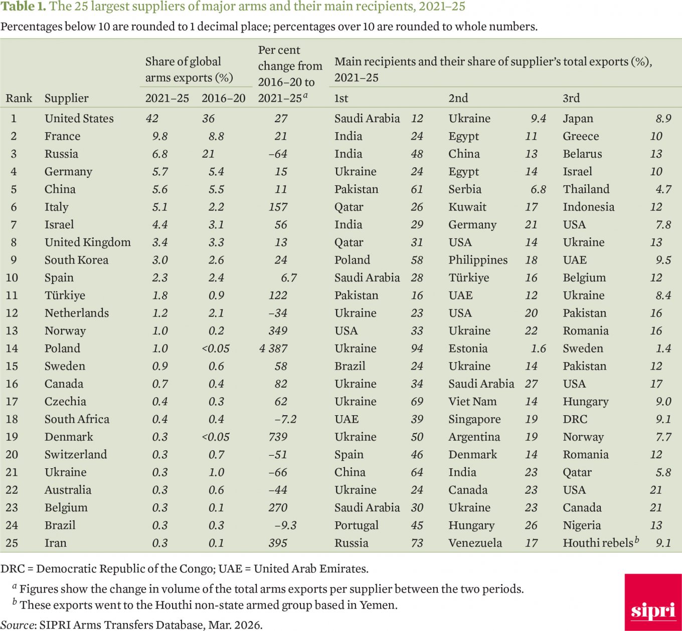 Водночас у SIPRI також порахували показники Україні, але вже у ключі отримання озброєння, тобто імпорту. І завдяки підтримці від західних країн-партнерів, які у вигляді допомоги "імпортували" до України озброєння з 2022 року, Україна здійснила за методологією SIPRI шалений стрибок у рейтингу саме імпортерів, збільшивши цей показник на 11896%, з 0,1% у період з 2016 по 2020 рік, до 9,7% від світового імпорту у 2021-2025 році.