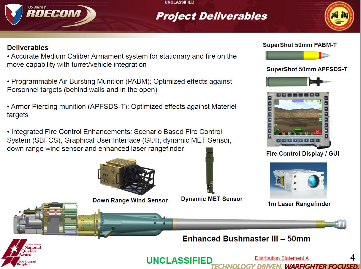 З цієї гармати БМП зможе стріляти спеціально розробленими уламково-фугасними програмованими XM1204 (HEAB-T), з трьома варіантами підриву: в повітрі, при контакті, та після перешкоди. Також в боєкомплекті будуть наявні ОБПС для ураження броньованих цілей.